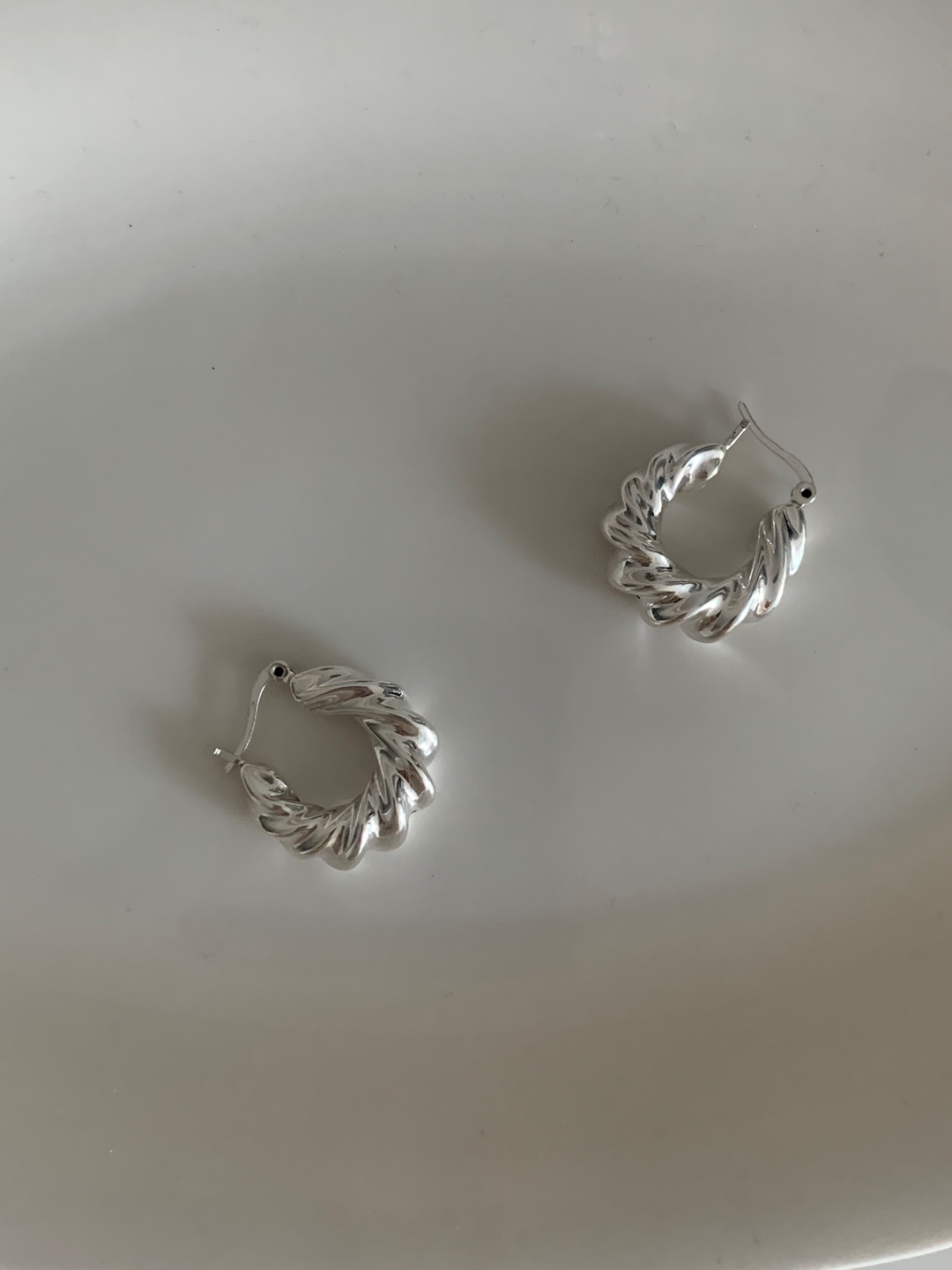 룩의 완성도를 높여주는 트위스트 쉐입의 볼드 후크 이어링.