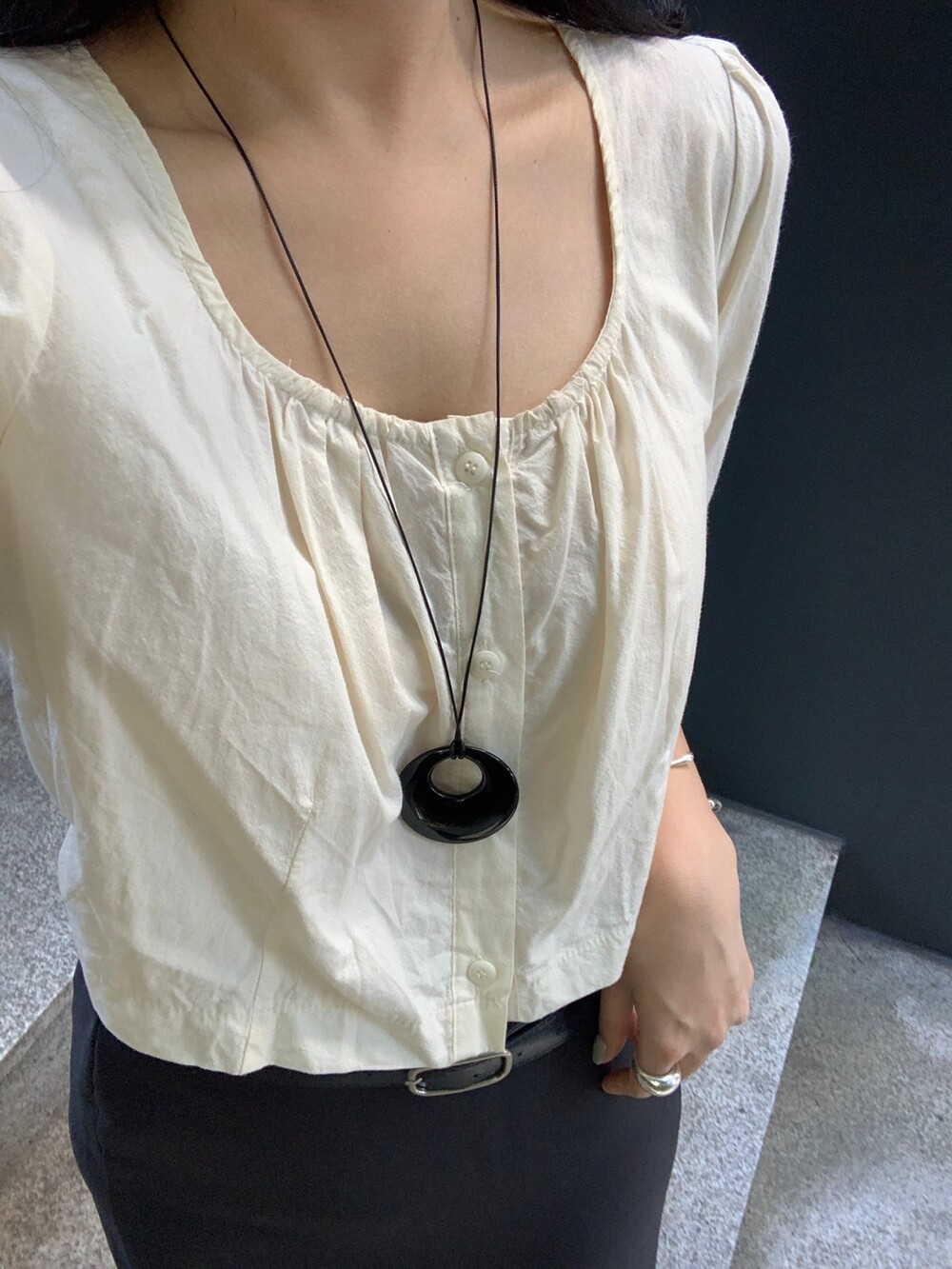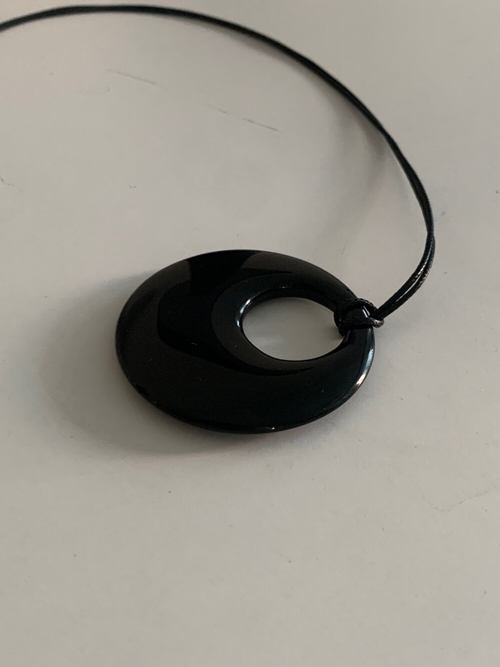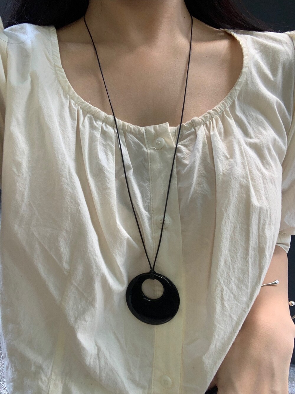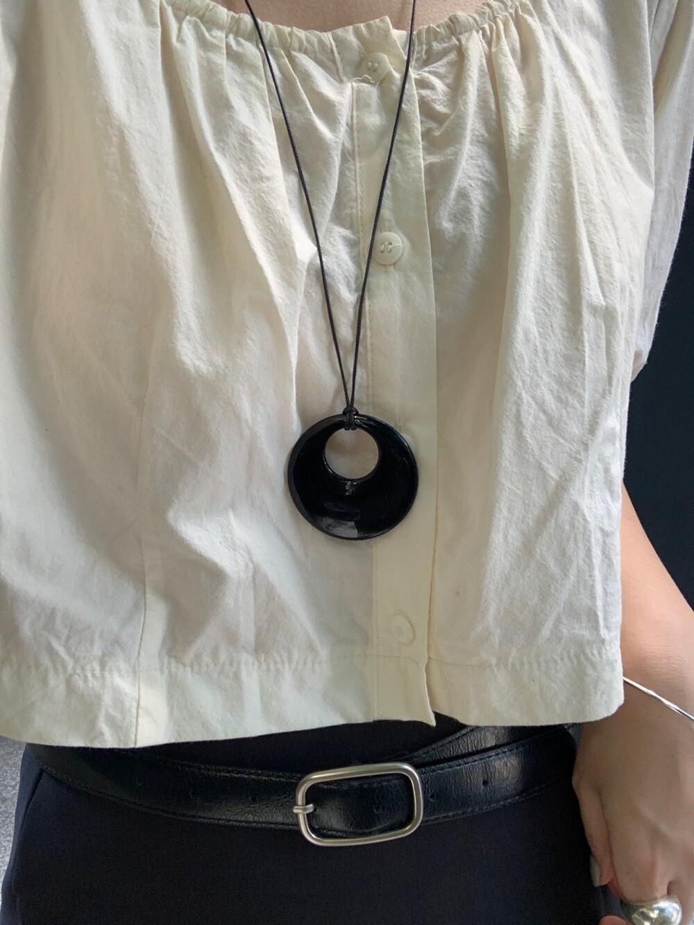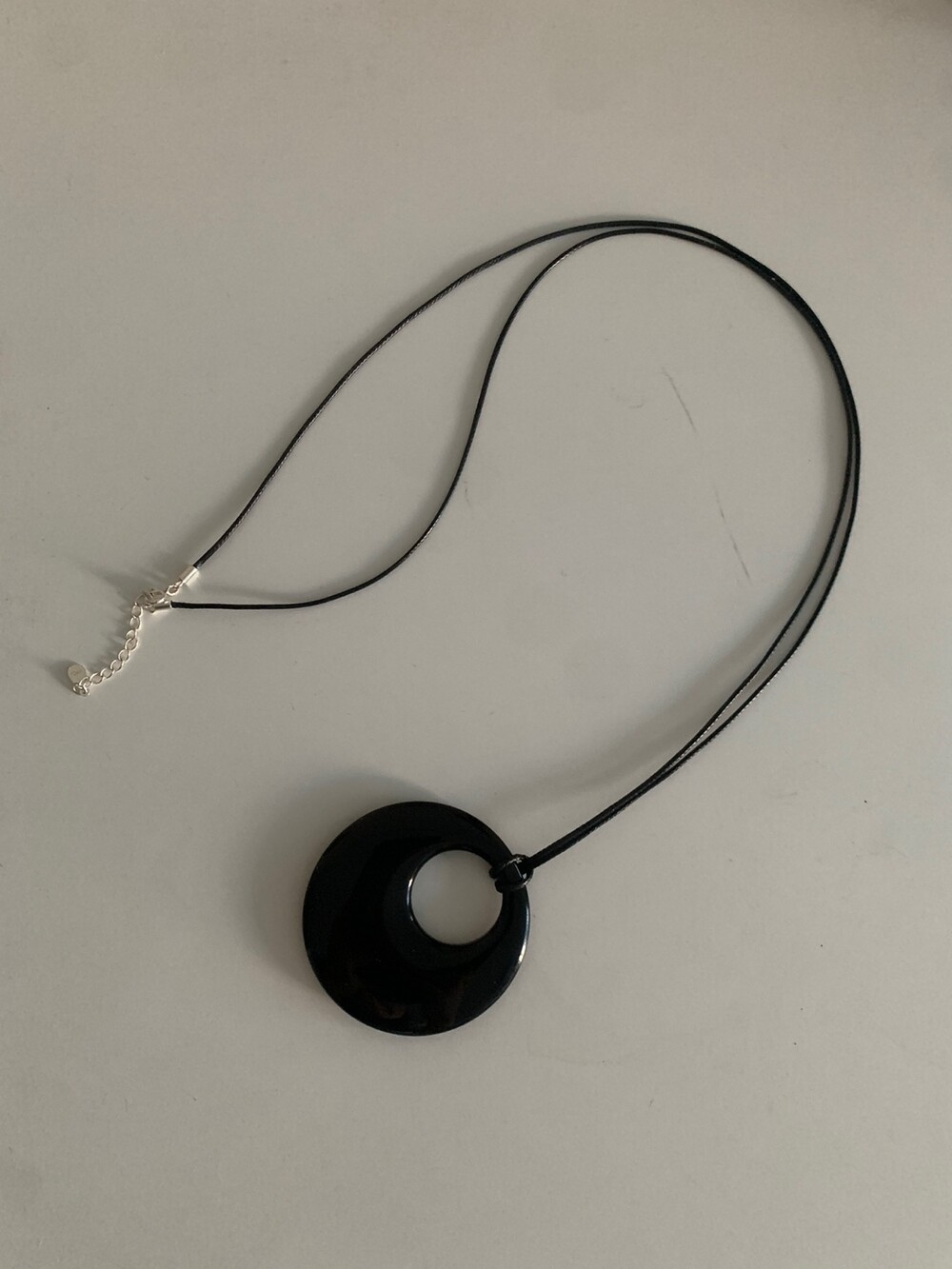 블랙옥 펜던트가 길게 떨어지는 스트랩에 달린 롱 네크리스.