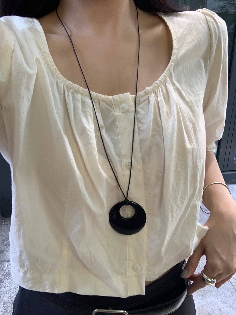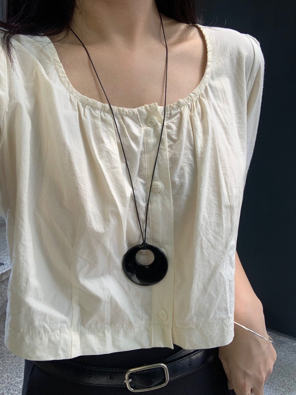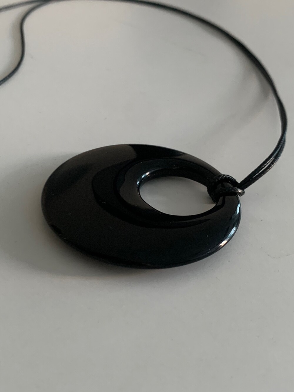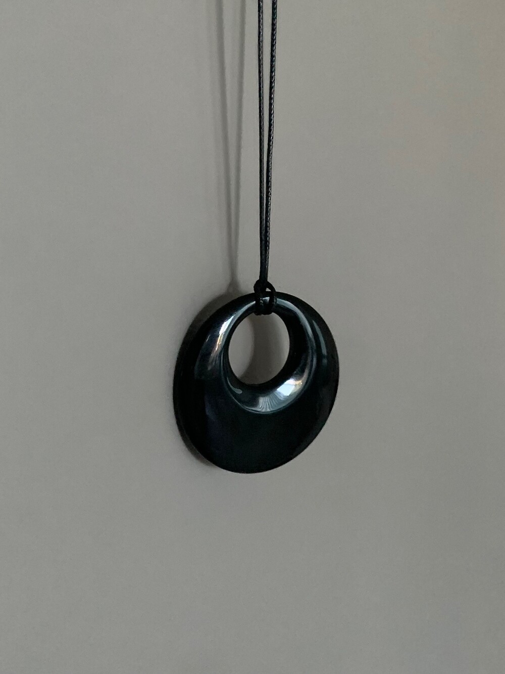 블랙옥 펜던트가 길게 떨어지는 스트랩에 달린 롱 네크리스.