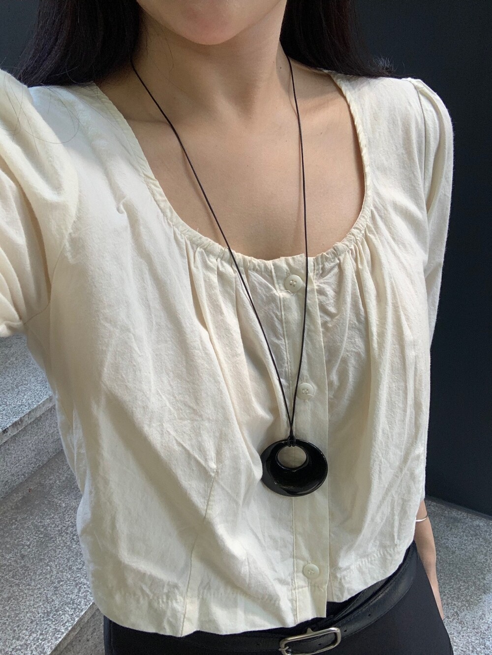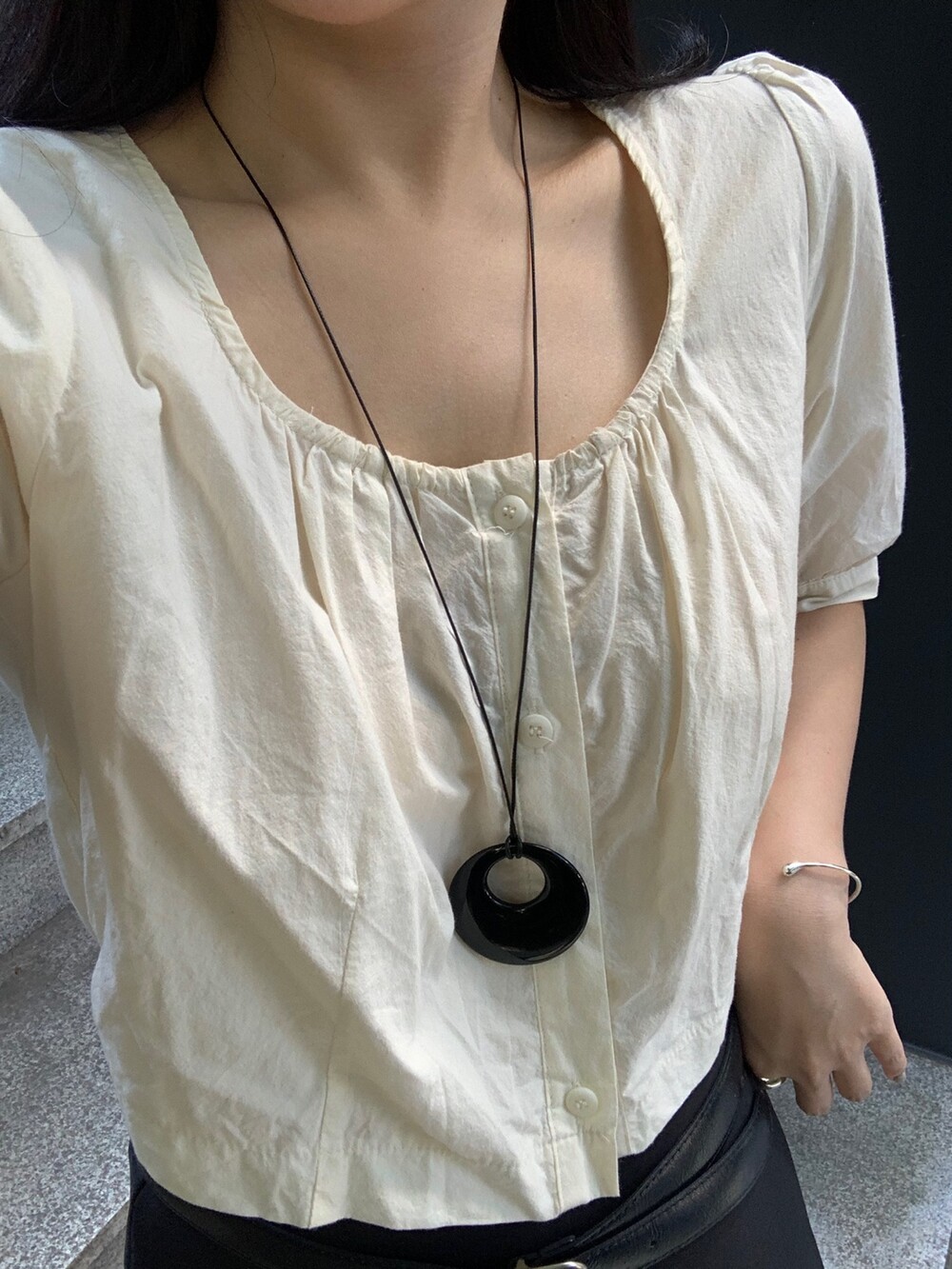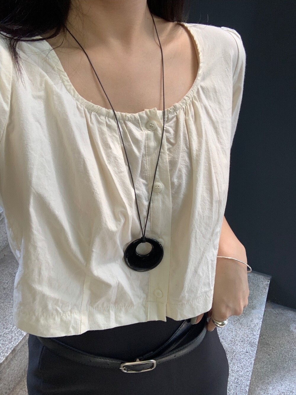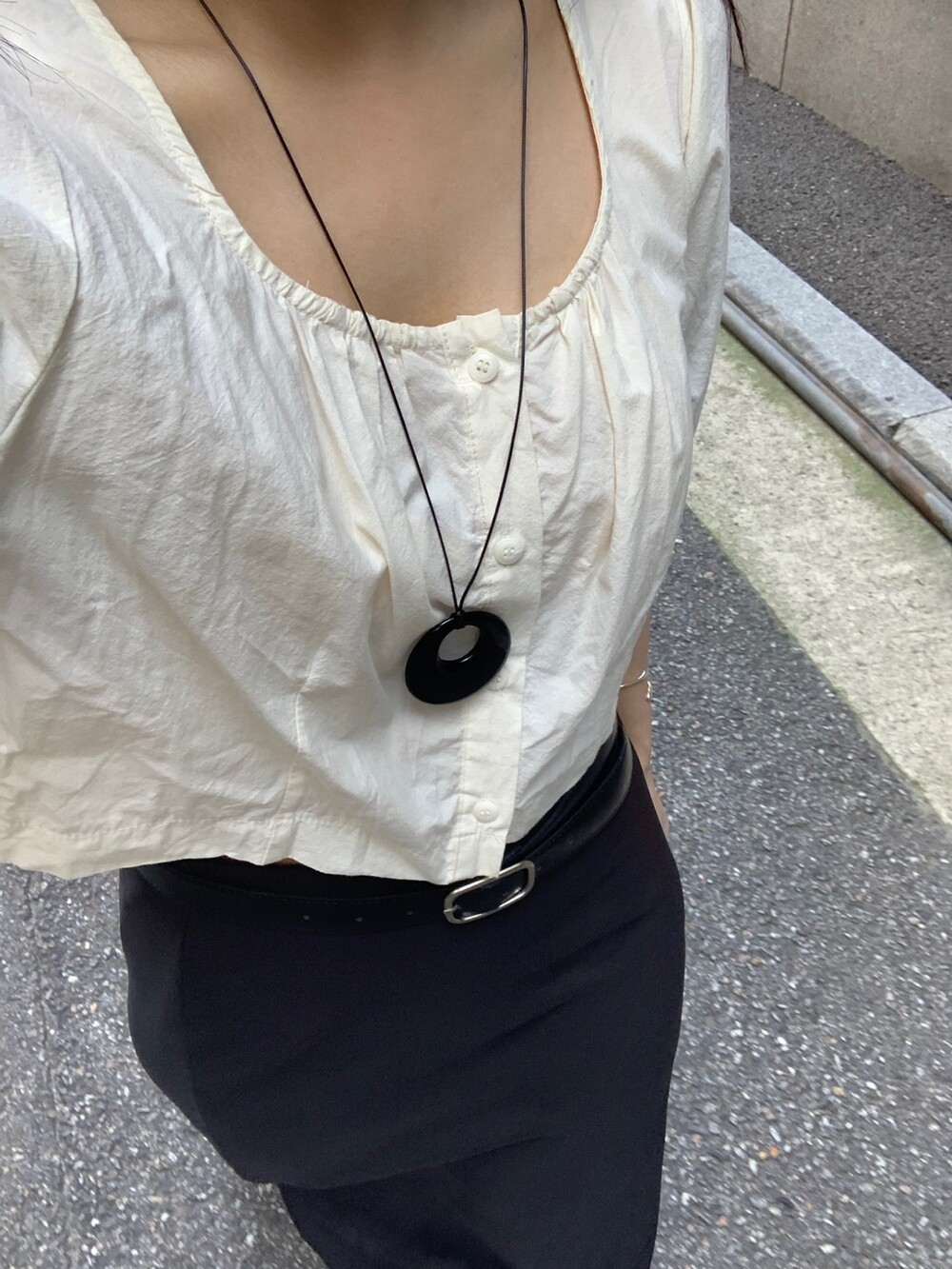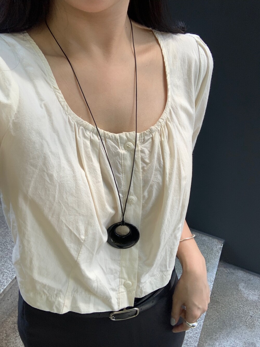 블랙옥 펜던트가 길게 떨어지는 스트랩에 달린 롱 네크리스.