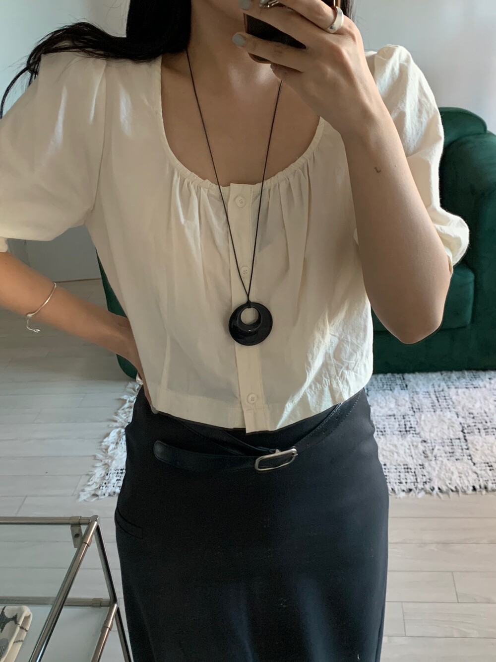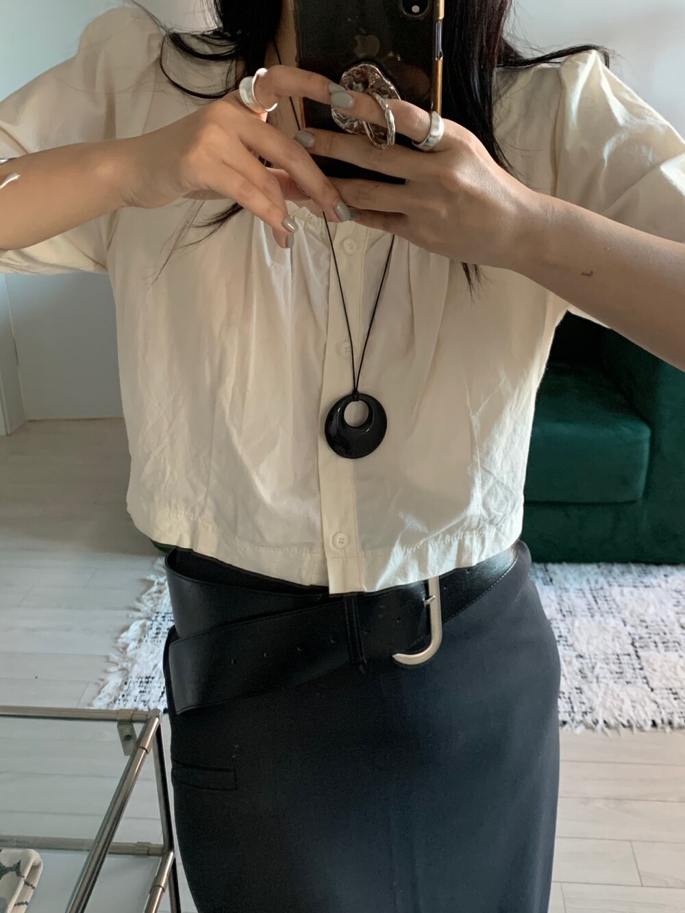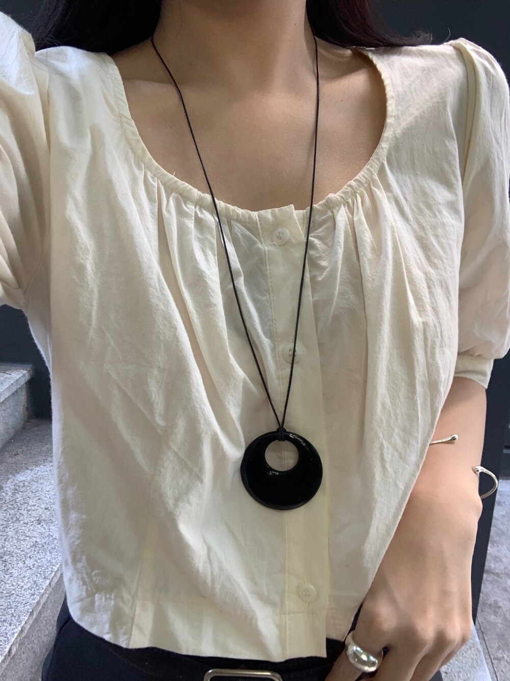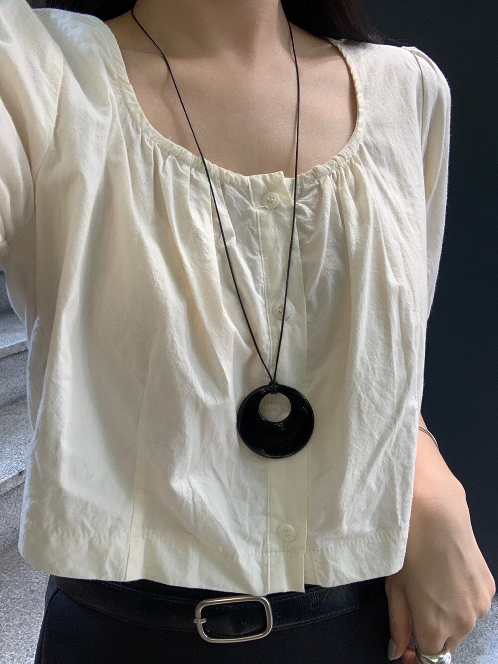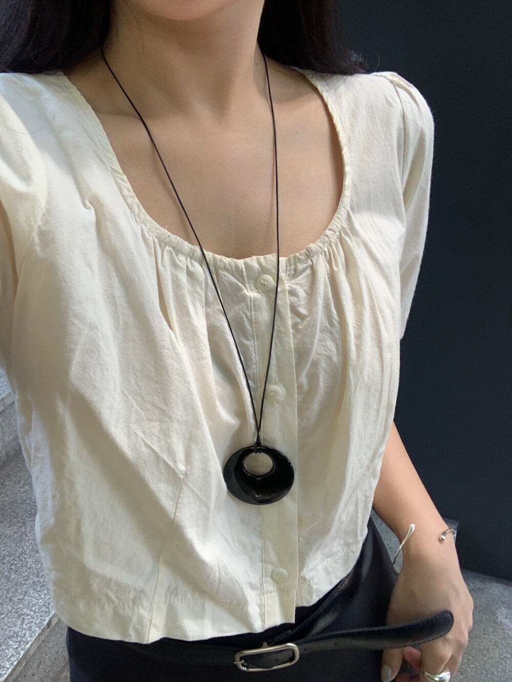 블랙옥 펜던트가 길게 떨어지는 스트랩에 달린 롱 네크리스.