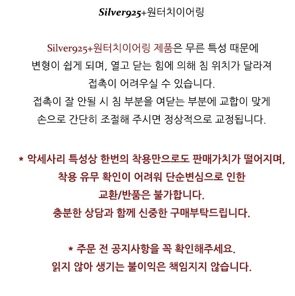 -악세사리 특성상 한번의 착용만으로도 판매가치가 떨어지며, 착용 유무 확인이 어려워 단순변심(크기,컬러,사이즈미스, 어울리지않음 등)으로 인한 교환 및 반품은 불가합니다. 충분한 상담과 함께 신중한 구매부탁드립니다.