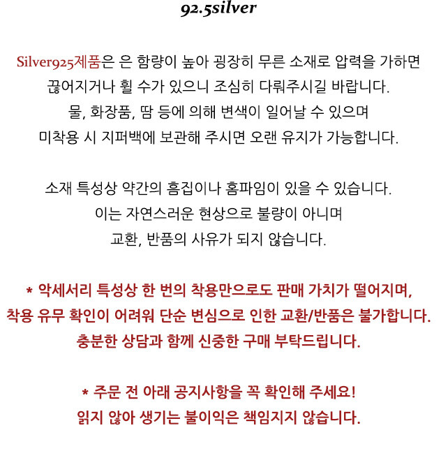 -악세사리 특성상 한번의 착용만으로도 판매가치가 떨어지며, 착용 유무 확인이 어려워 단순변심(크기,컬러,사이즈미스, 어울리지않음 등)으로 인한 교환 및 반품은 불가합니다. 충분한 상담과 함께 신중한 구매부탁드립니다.