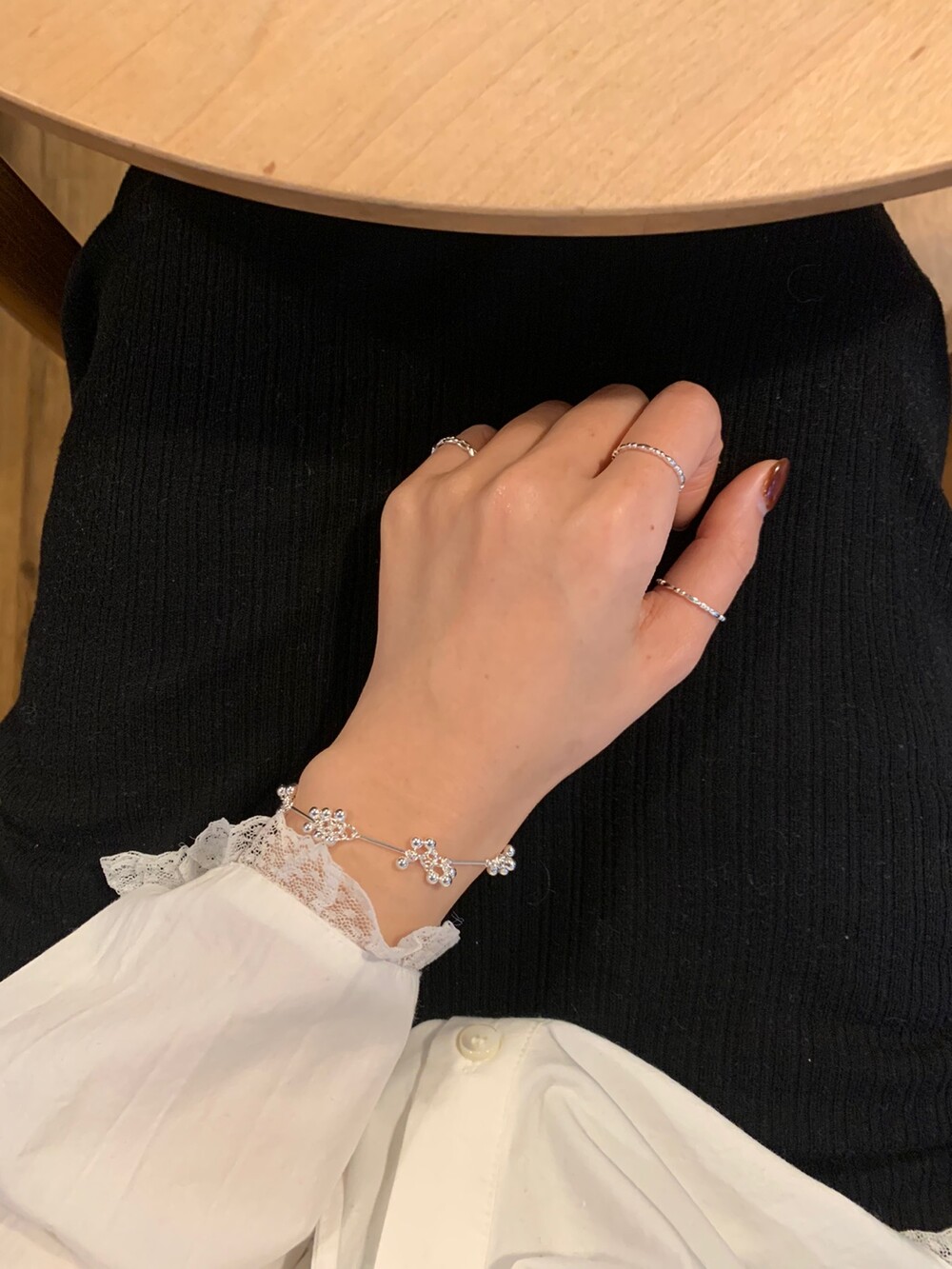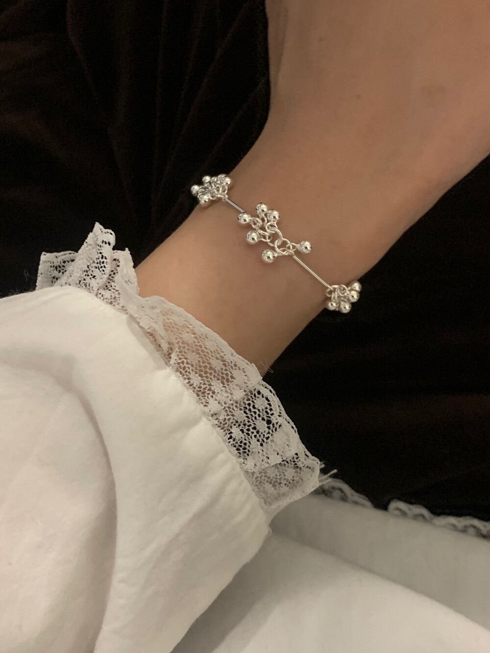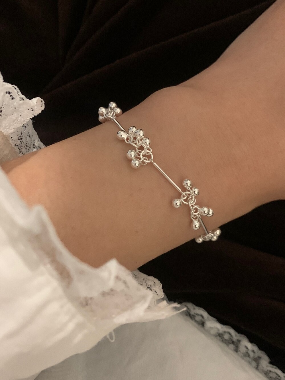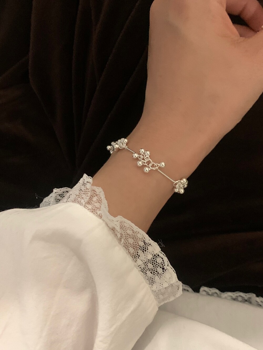 가볍게 이어진 볼들이 손목을 따라 부드럽게 흐르며, 움직일 때마다 자연스럽게 달랑거리며 멋스러운 포인트를 더해줍니다. 손목에 착용했을 때 확실히 시선을 사로잡는 디테일로, 단독 착용만으로도 스타일리시한 무드를 완성해줘요!