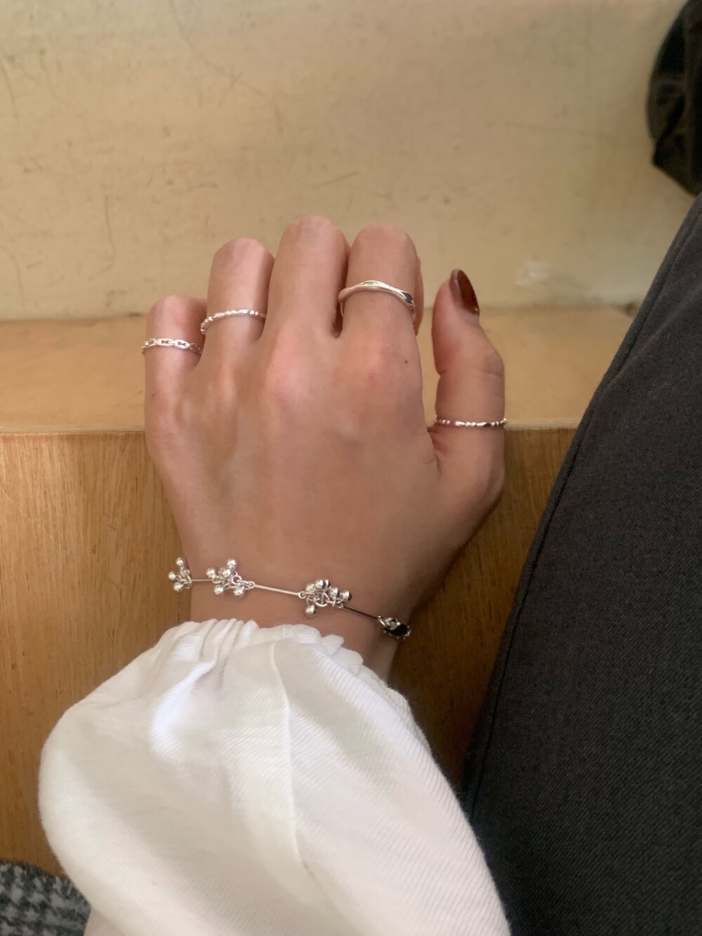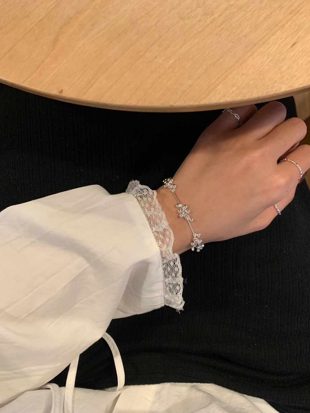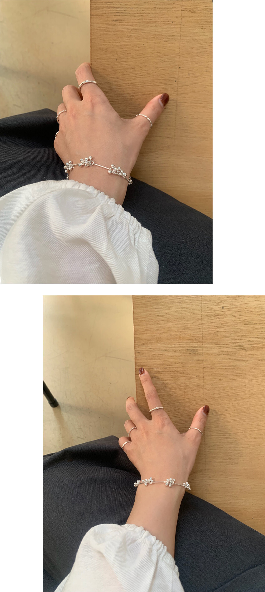 가볍게 이어진 볼들이 손목을 따라 부드럽게 흐르며, 움직일 때마다 자연스럽게 달랑거리며 멋스러운 포인트를 더해줍니다. 손목에 착용했을 때 확실히 시선을 사로잡는 디테일로, 단독 착용만으로도 스타일리시한 무드를 완성해줘요!