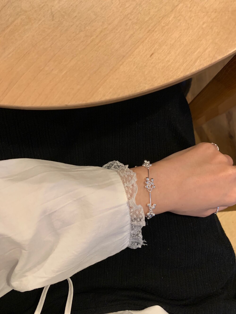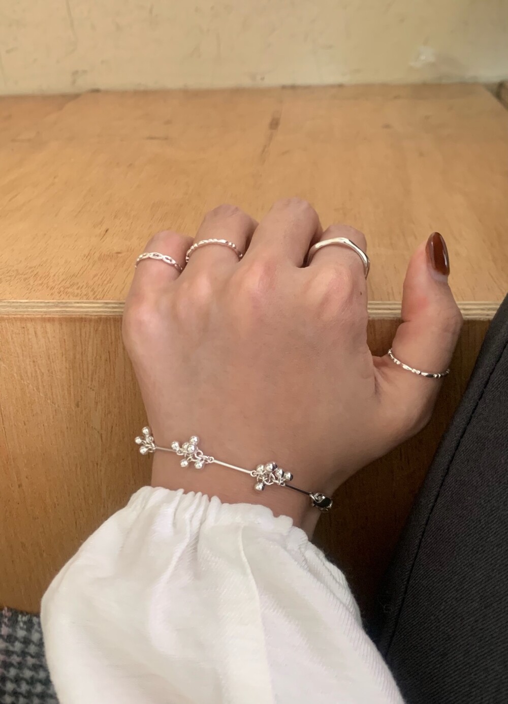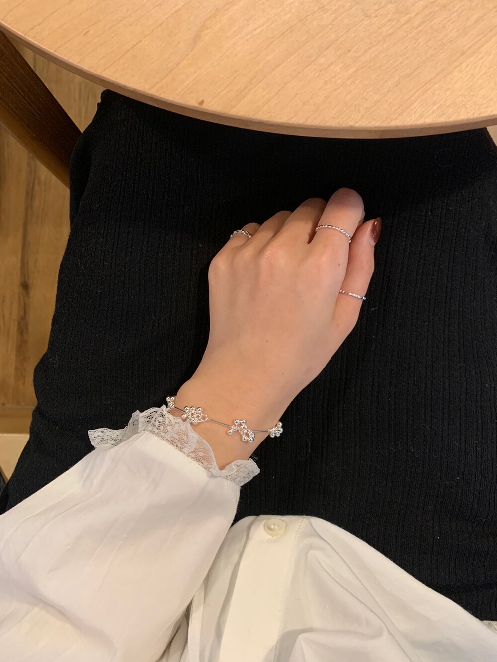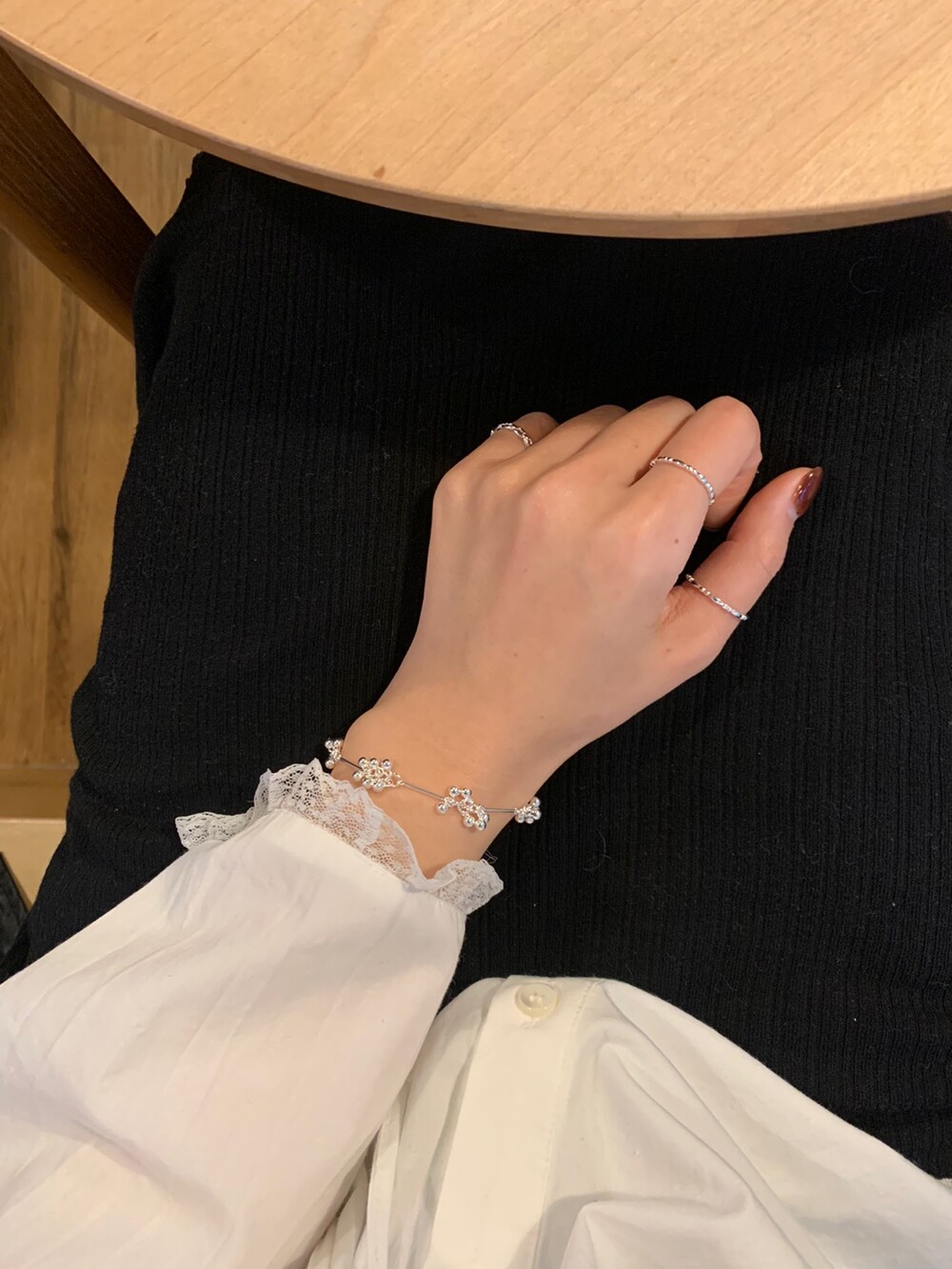 가볍게 이어진 볼들이 손목을 따라 부드럽게 흐르며, 움직일 때마다 자연스럽게 달랑거리며 멋스러운 포인트를 더해줍니다. 손목에 착용했을 때 확실히 시선을 사로잡는 디테일로, 단독 착용만으로도 스타일리시한 무드를 완성해줘요!