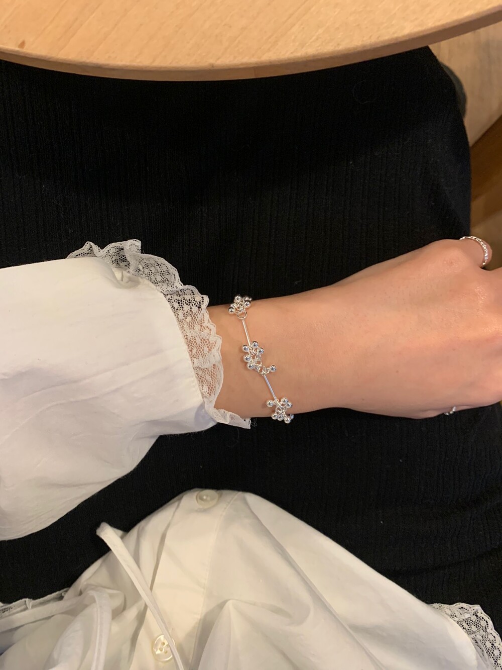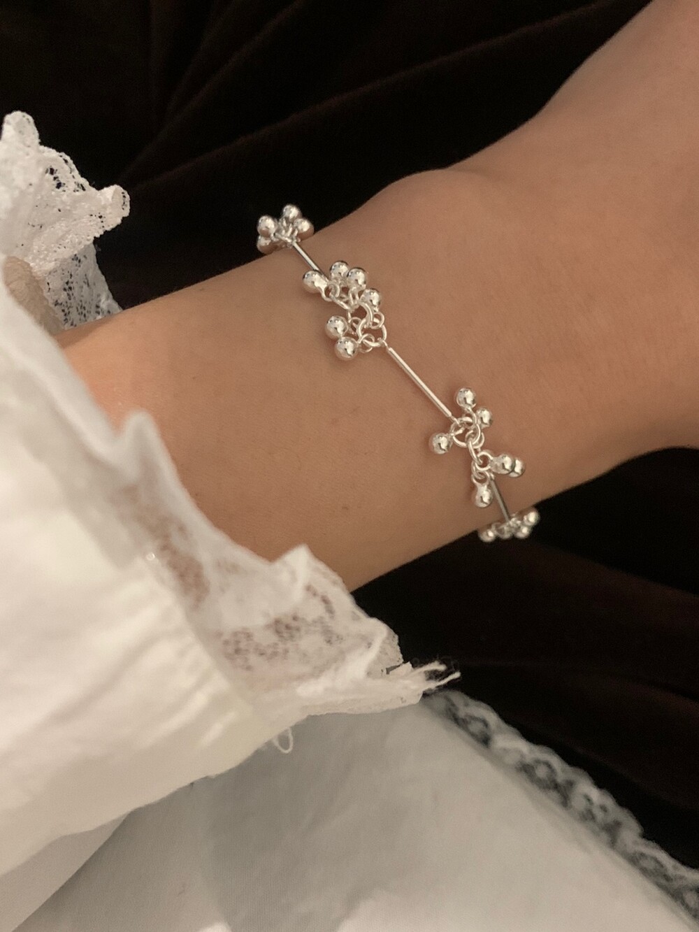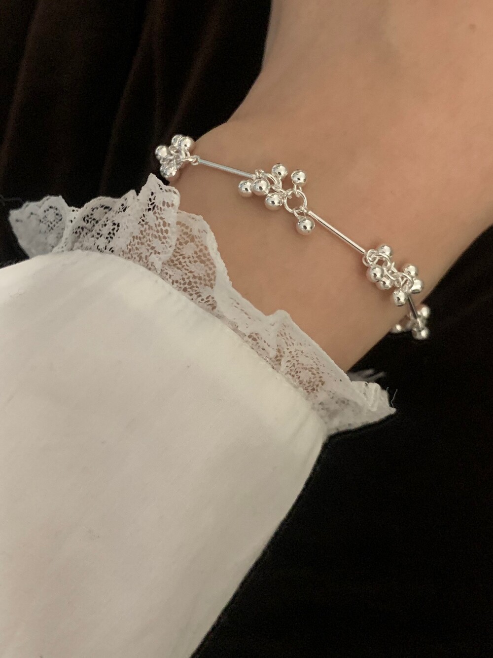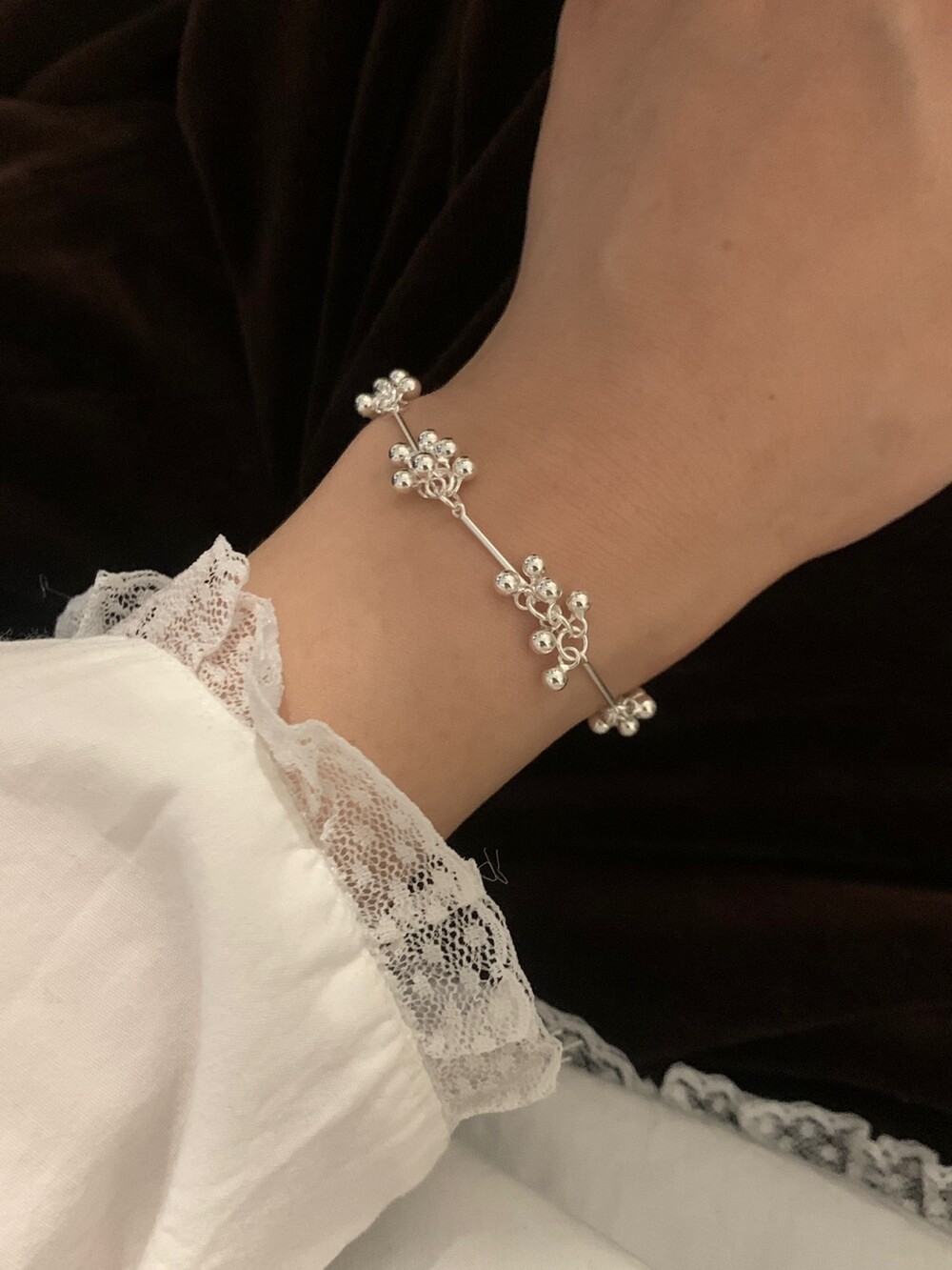 작은 실버 구슬들이 모여 멋스러운 디자인을 완성한 감각적인 브레이슬릿.