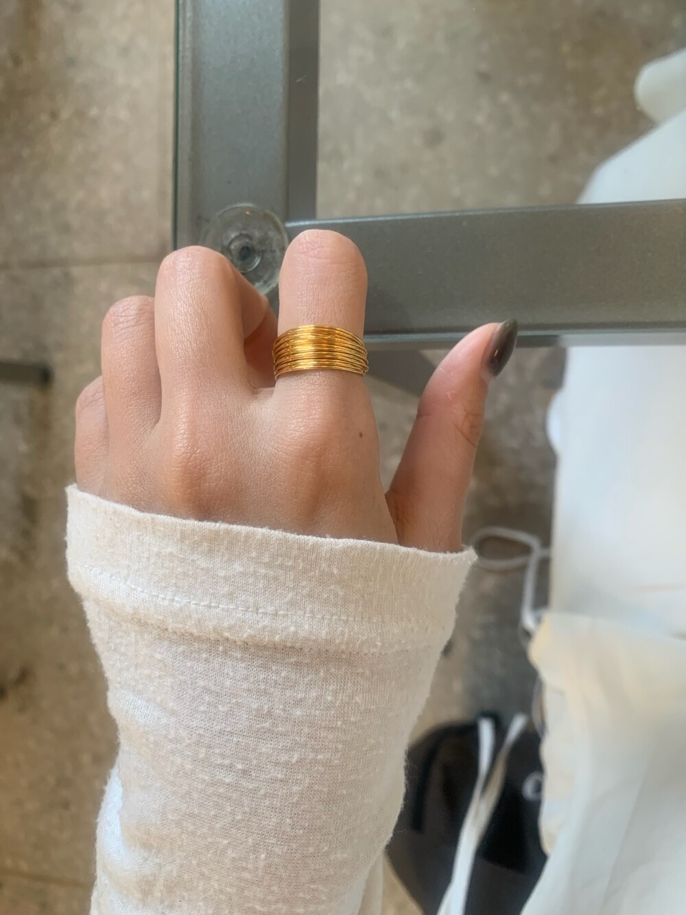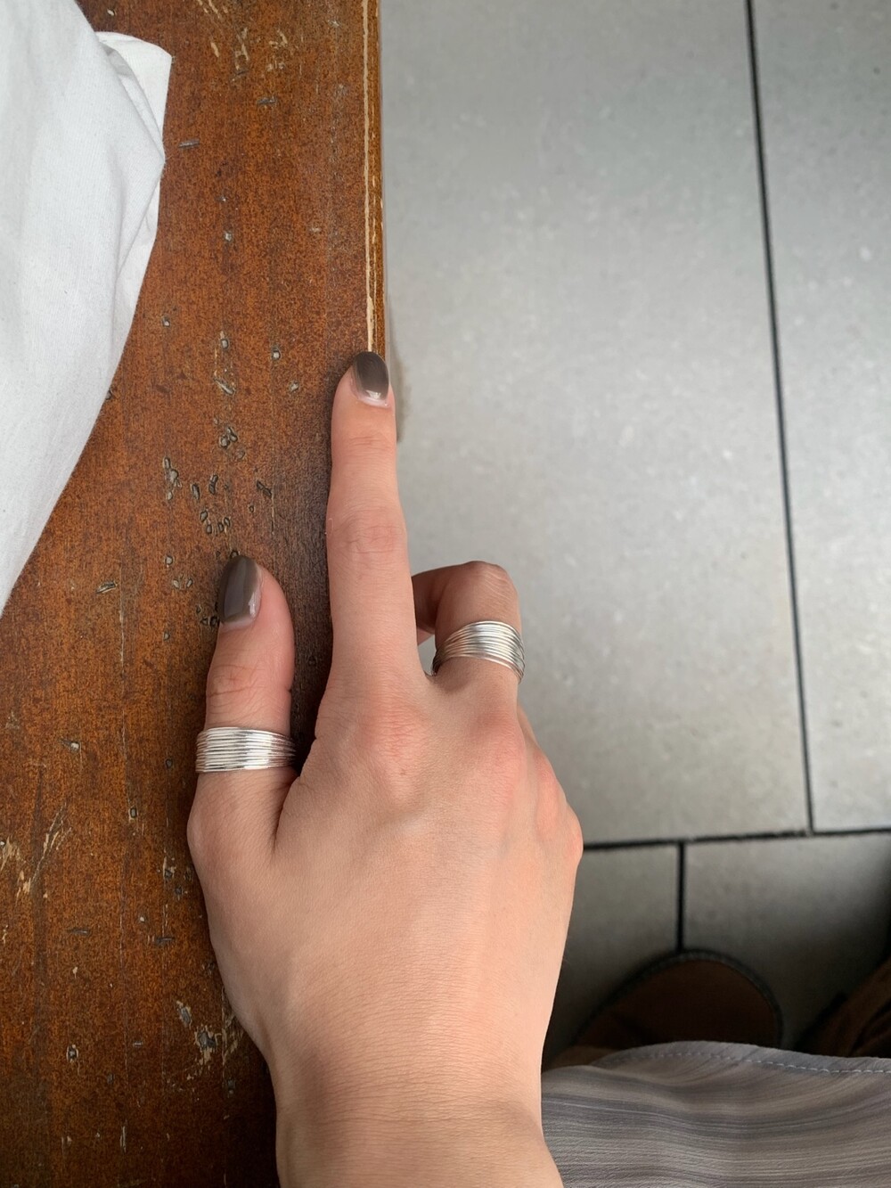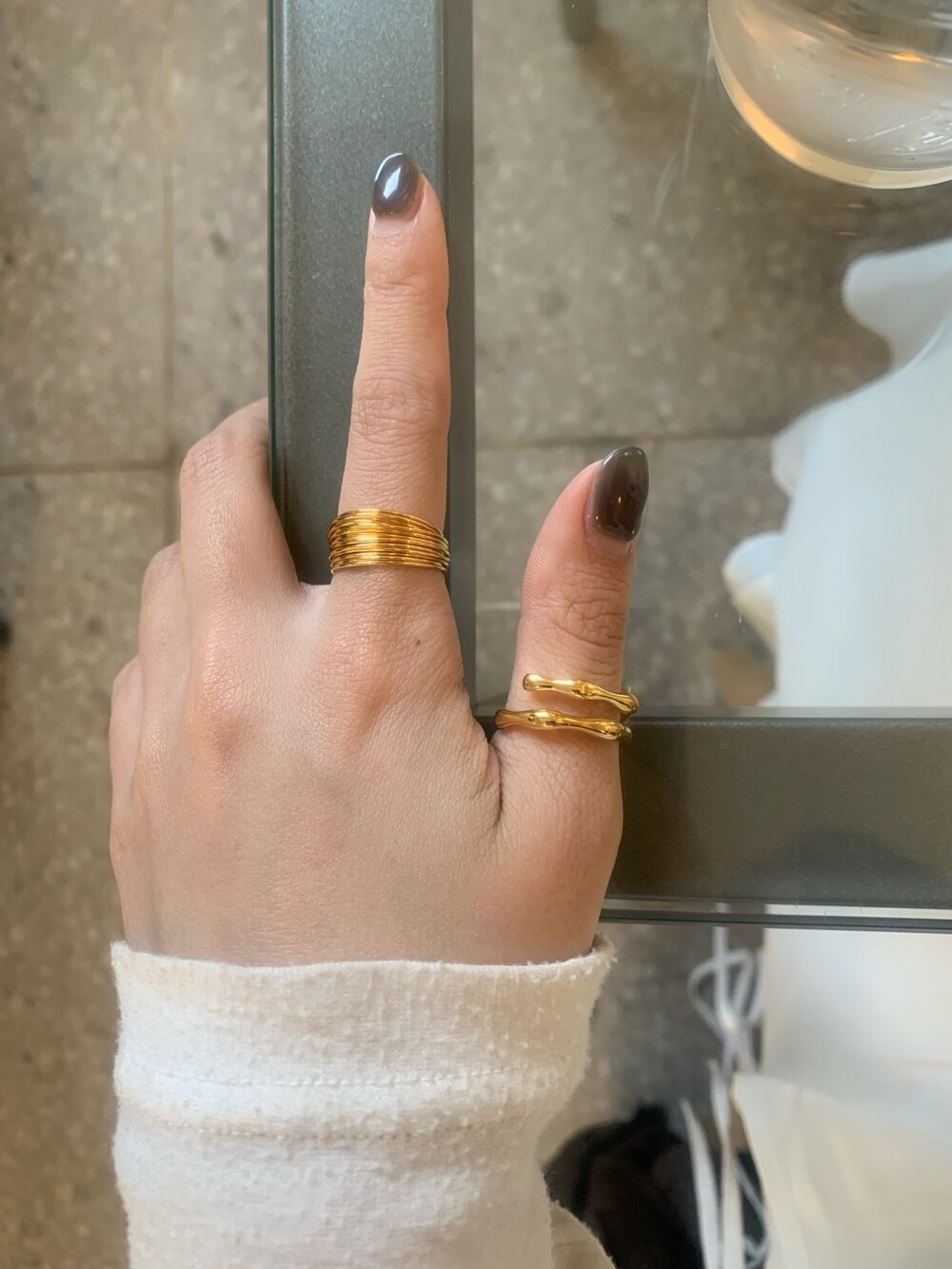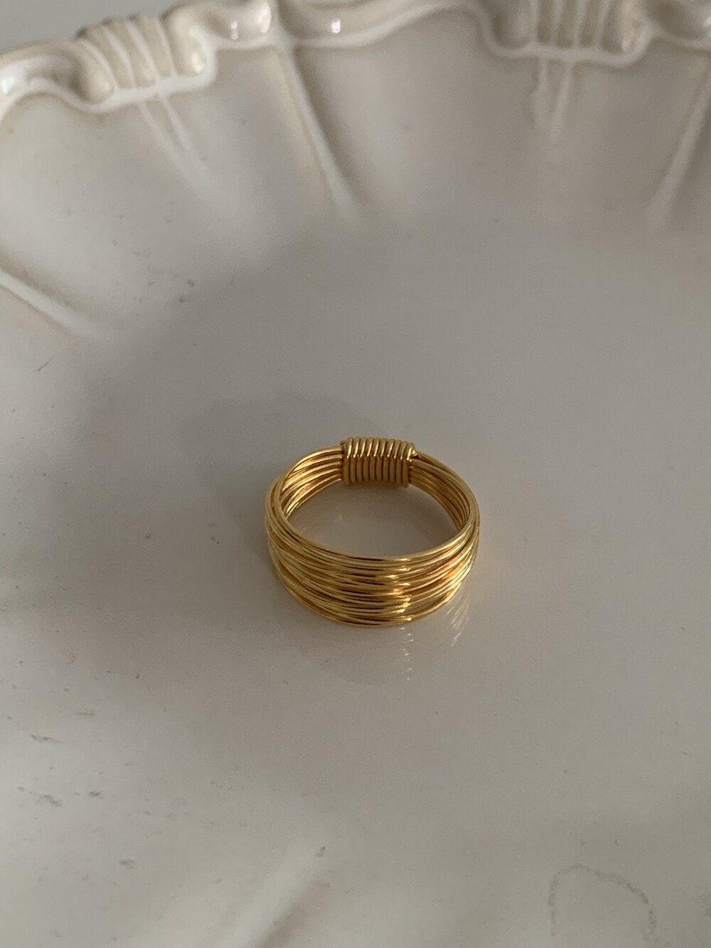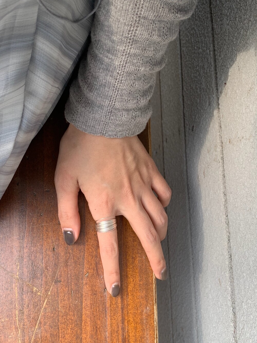 손끝을 감싸듯 겹겹이 감긴 실타래 텍스처가 인상적인 링.